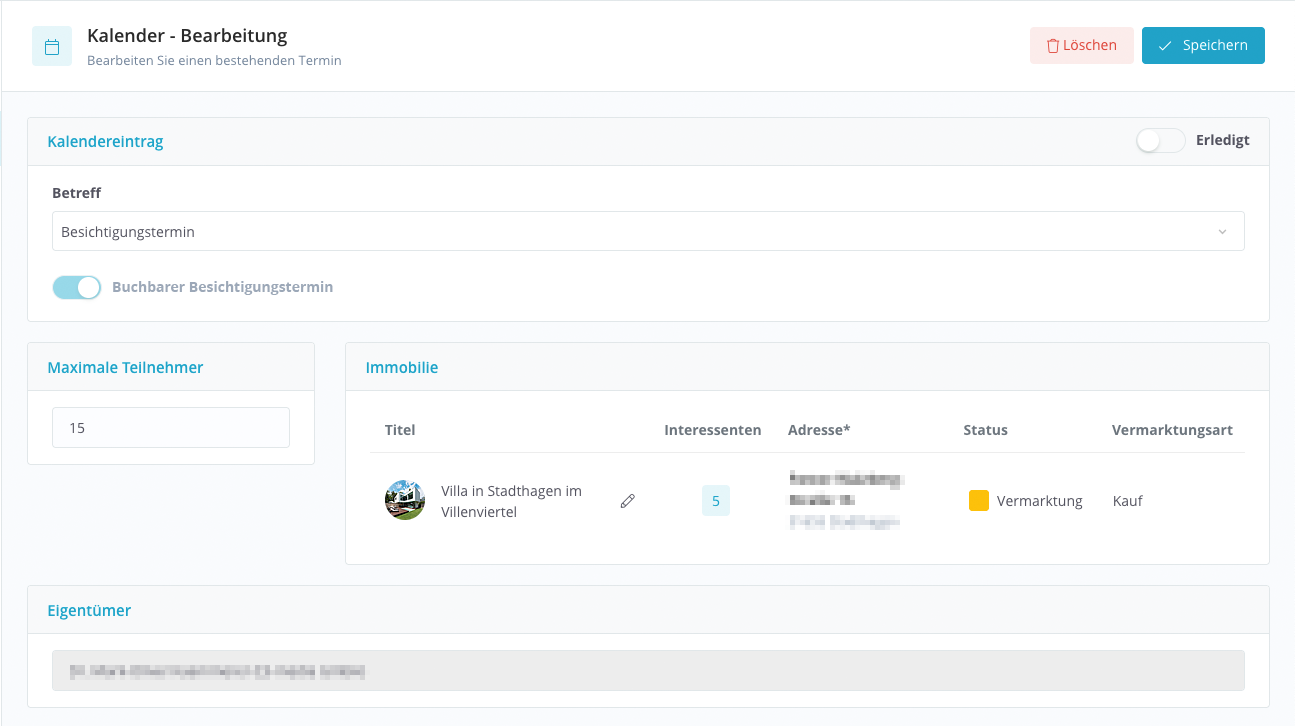 Ist der Immobilie ein Eigentümer oder Verwalter zugeordnet, wird dieser automatisch angezeigt.